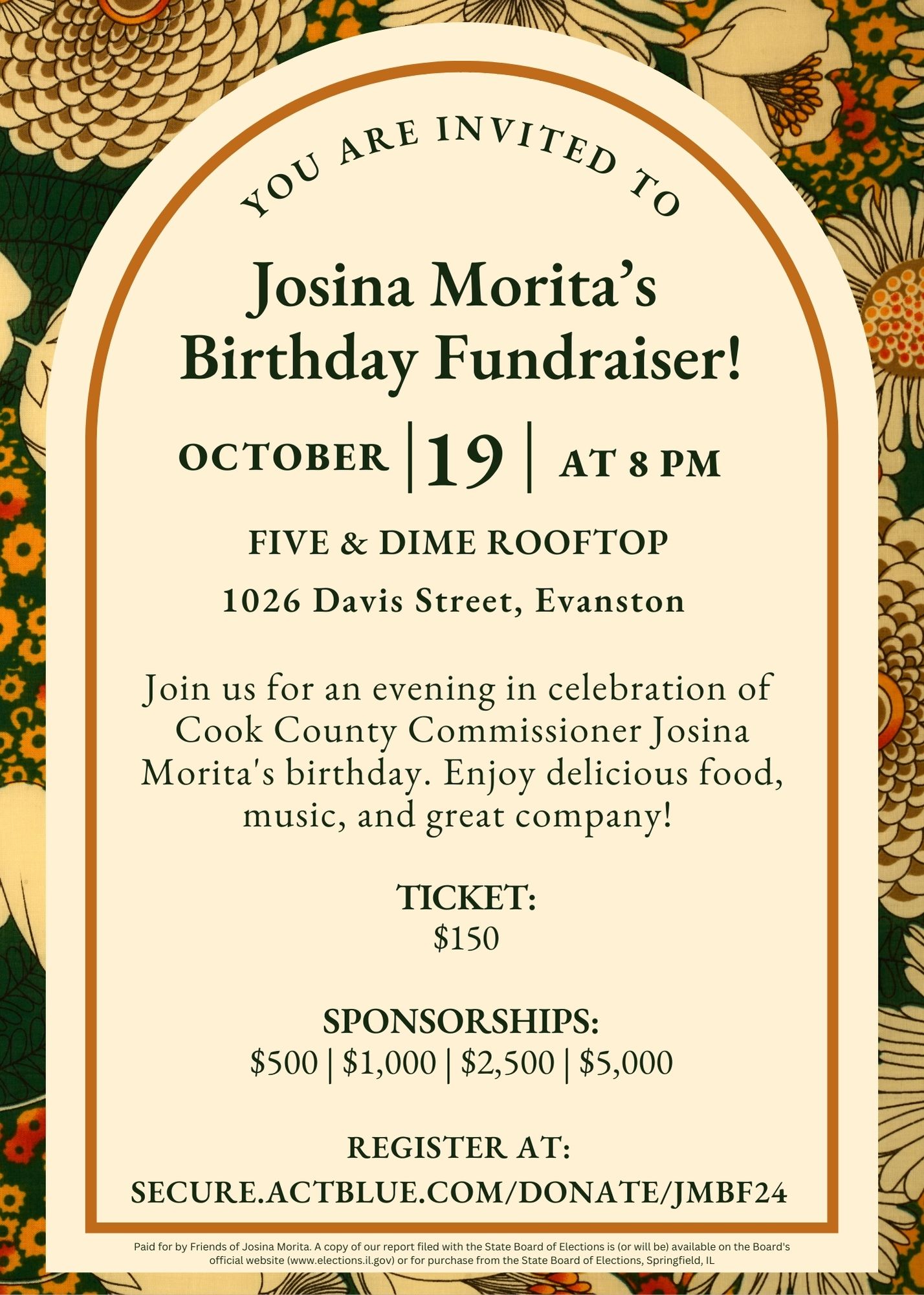 Celebrate Cook County Commissioner Josina Morita's birthday with an evening of delicious food, music, and great company!