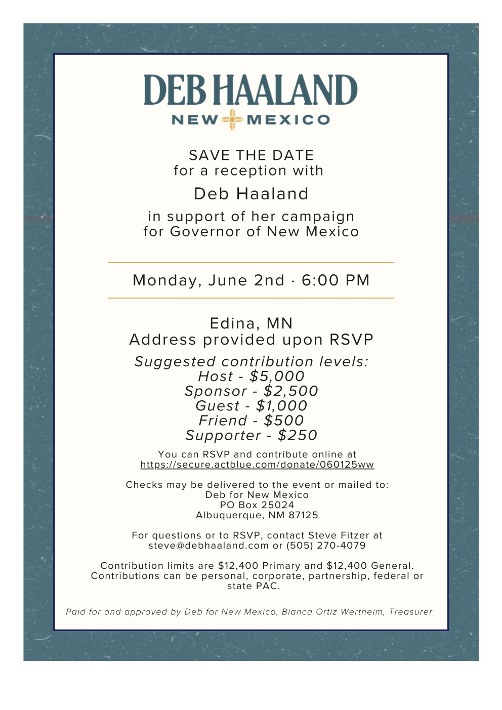 Join Deb Haaland for a reception June 2nd at 6:00 pm