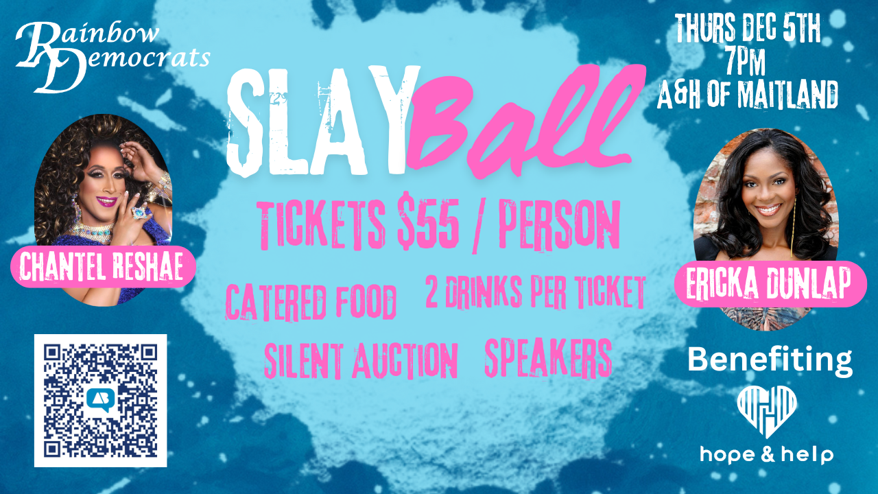 Join the Rainbow Democrats and our special guests at our Slay Ball on Thursday, December 5, 2024. Watch for announcements about our special guests!