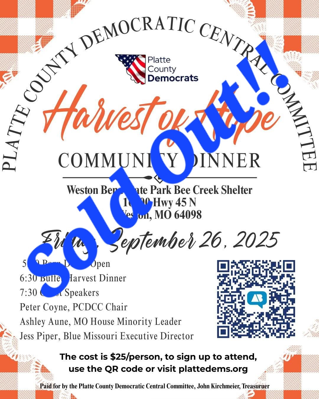 Join Platte County Democrats for a Fall Family Dinner at Weston Bend State Park! We're raising funds for our 2026 Midterm Election Headquarters. Can't wait to see you there!