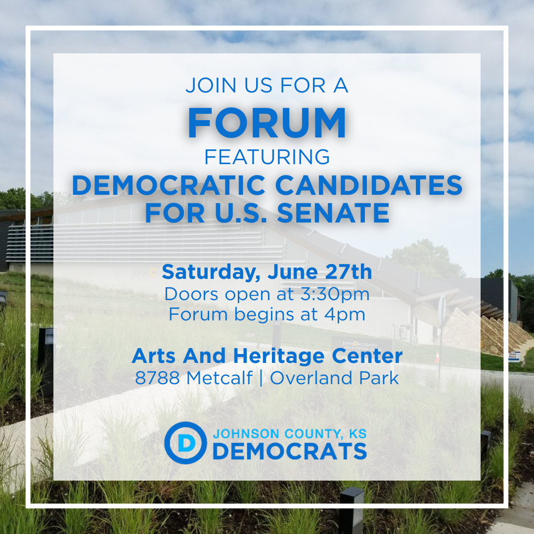 The Johnson County Democratic Party is pleased to present a forum featuring candidates for the 2026 U.S. Senate race. We invite you to join us as each candidate outlines their vision and qualifications, making the case for why they are best positioned to serve as the Democratic nominee in the general election against Senator Roger Marshall.