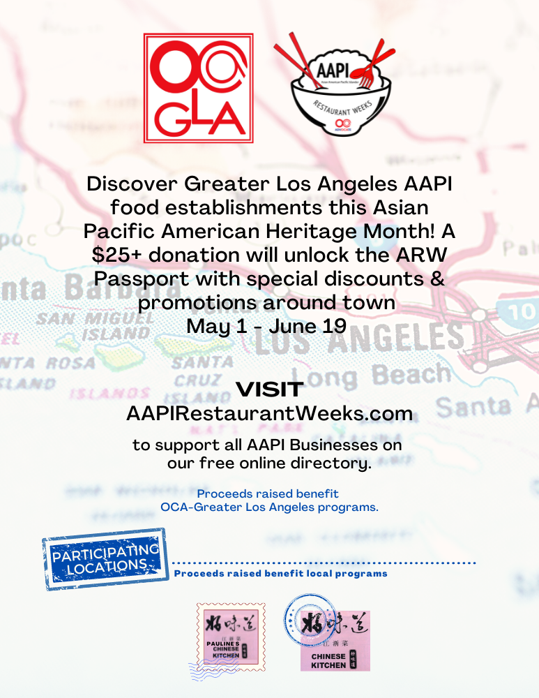 ***AAPI Restaurant Weeks is a program managed by OCA-Greater Houston however, funds raised through this link will go to OCA Los Angeles.