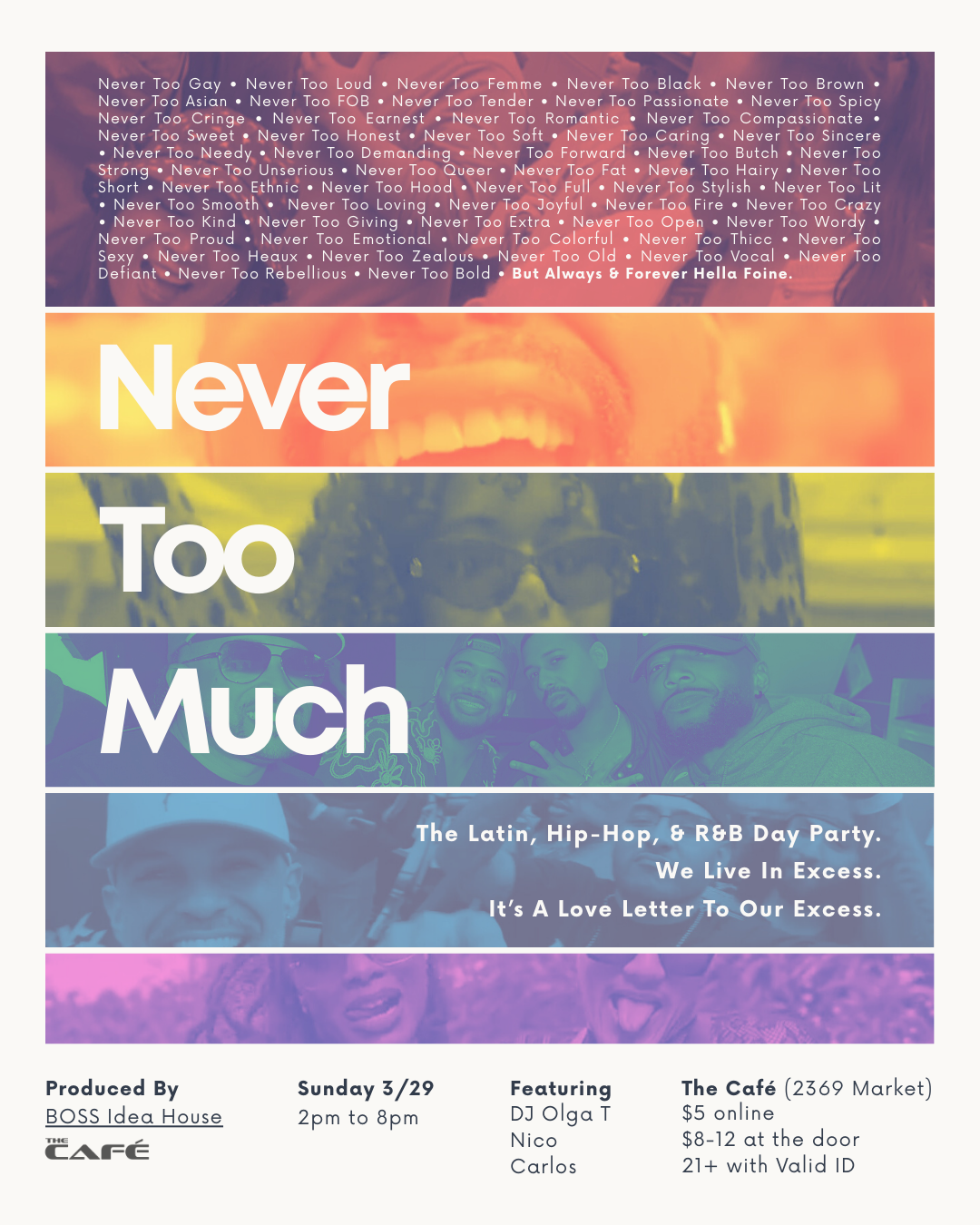 We know the words to the song. And the core message is: you can never be too much. *We* are never too much, family — no part of us, never a day or time. So let's celebrate that excess with a brand new Sunday Funday event in the Castro.