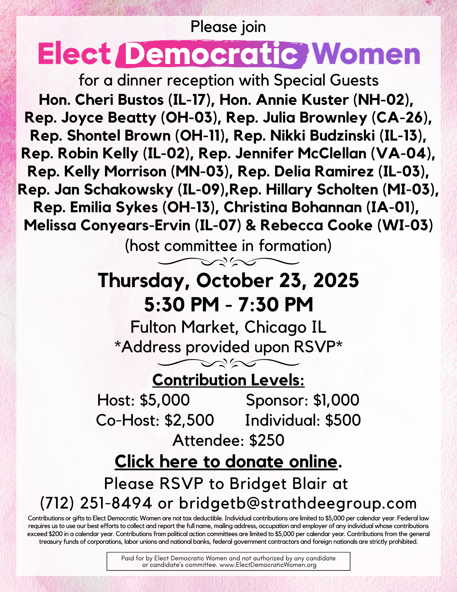 By entering your phone number and participating, you agree to the terms & privacy policy for recurring autodialed marketing messages from Elect Democratic Women PAC to the phone number you provide. No consent required to buy. Msg & data rates may apply.