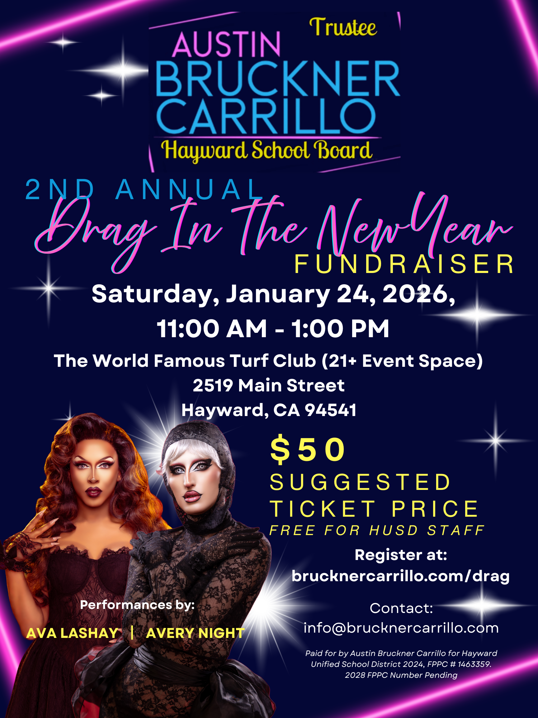 Join Austin Bruckner Carrillo for his second annual Drag In the New Year Fundraiser to elect champions of public education.