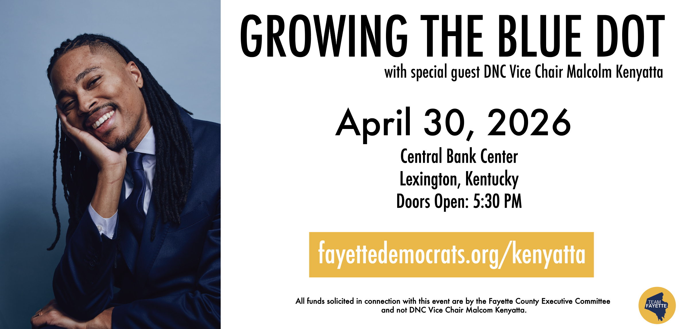 All funds solicited in connection with this event are by the Fayette County Executive Committee and not DNC Vice Chair Malcom Kenyatta.