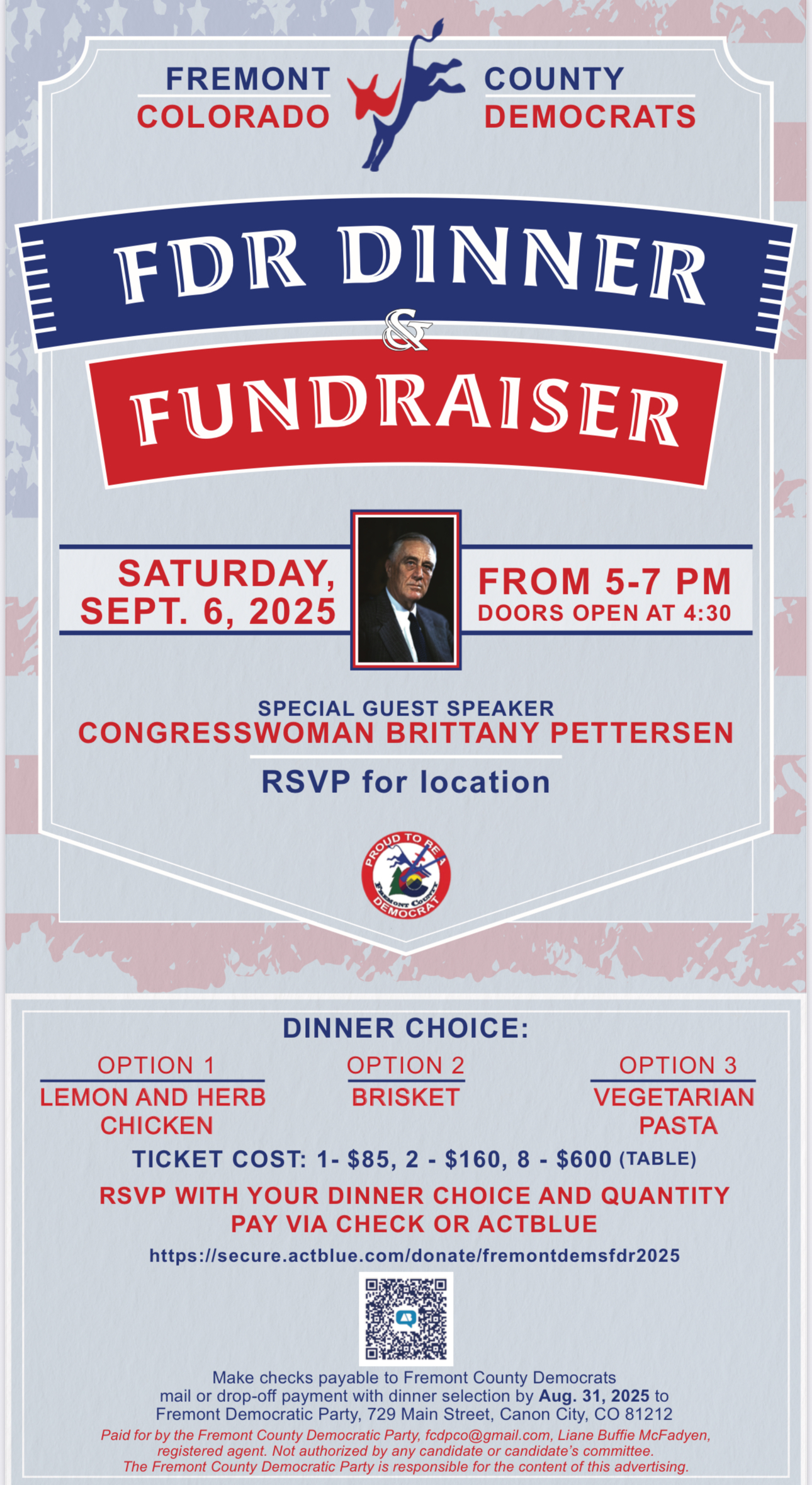 Paid for by the Fremont County Democratic Party, fcdpco@gmail.com, Liane McFadyen, registered agent. Not authorized by any candidate or candidates committee. The Fremont County Democratic Party is responsible for the content of this advertising.