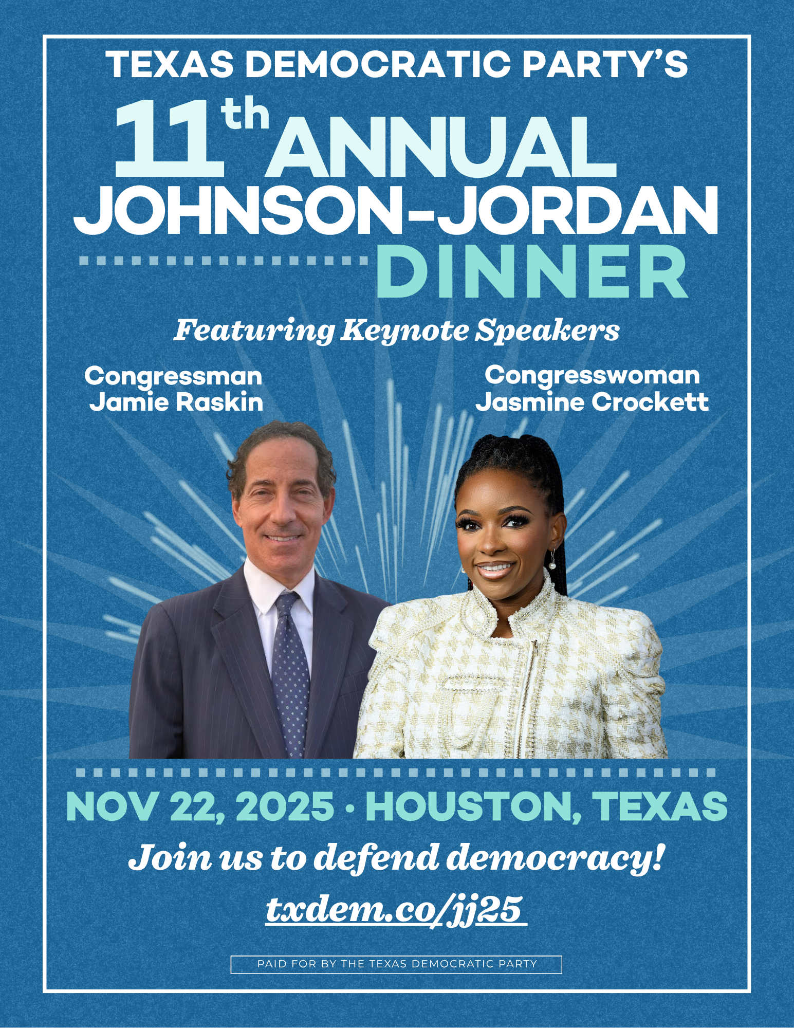 The Texas Democratic Party would like to formally invite you to participate in the 2025 annual Johnson-Jordan Dinner on Saturday, November 22nd in Houston, TX.