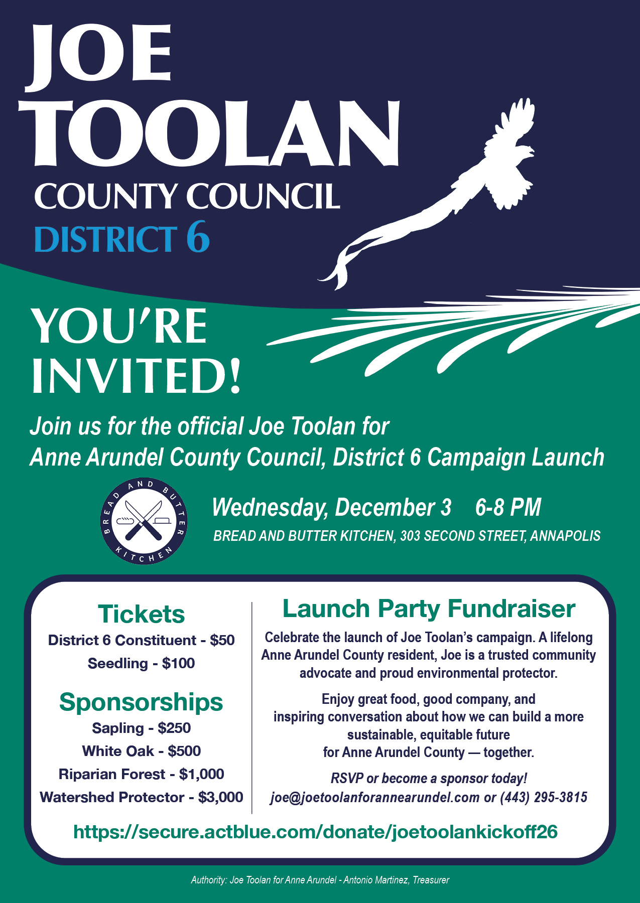 Celebrate the Launch of Joe Toolan's Campaign - a lifelong Anne Arundel County resident, Joe is a trusted community advocate and proud environmental protector. He needs your support!