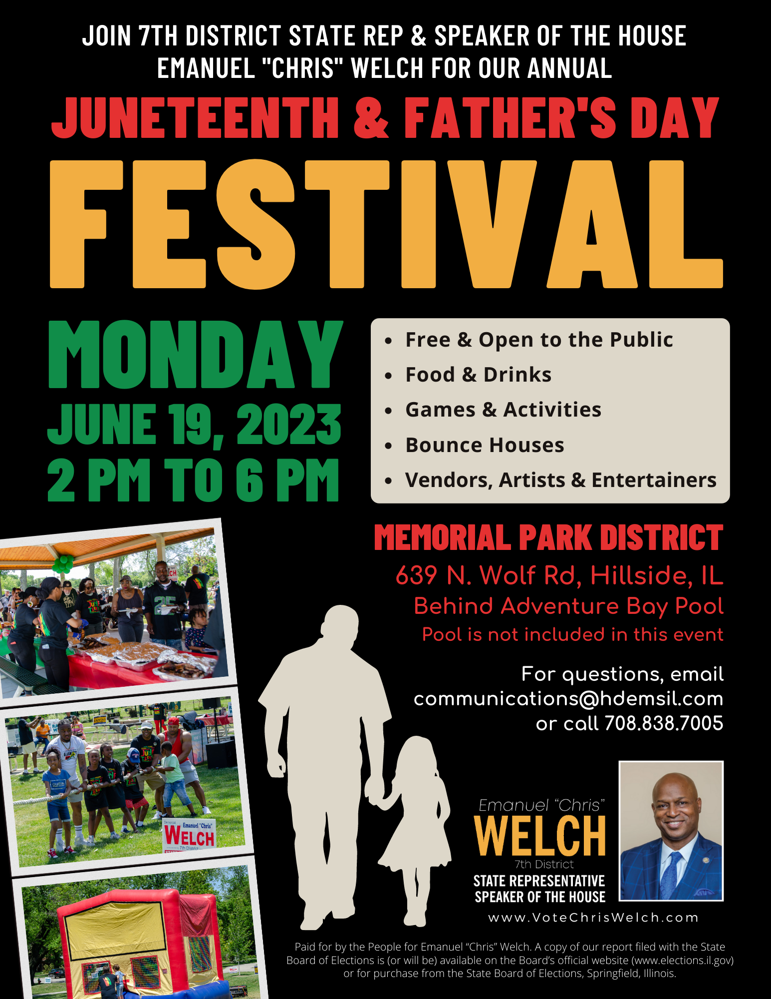Join 7th District State Representative and Speaker of the House Emanuel “Chris” Welch for Our Annual Juneteenth and Father’s Day Festival. Promote your business and connect with the community. Become an event sponsor today!