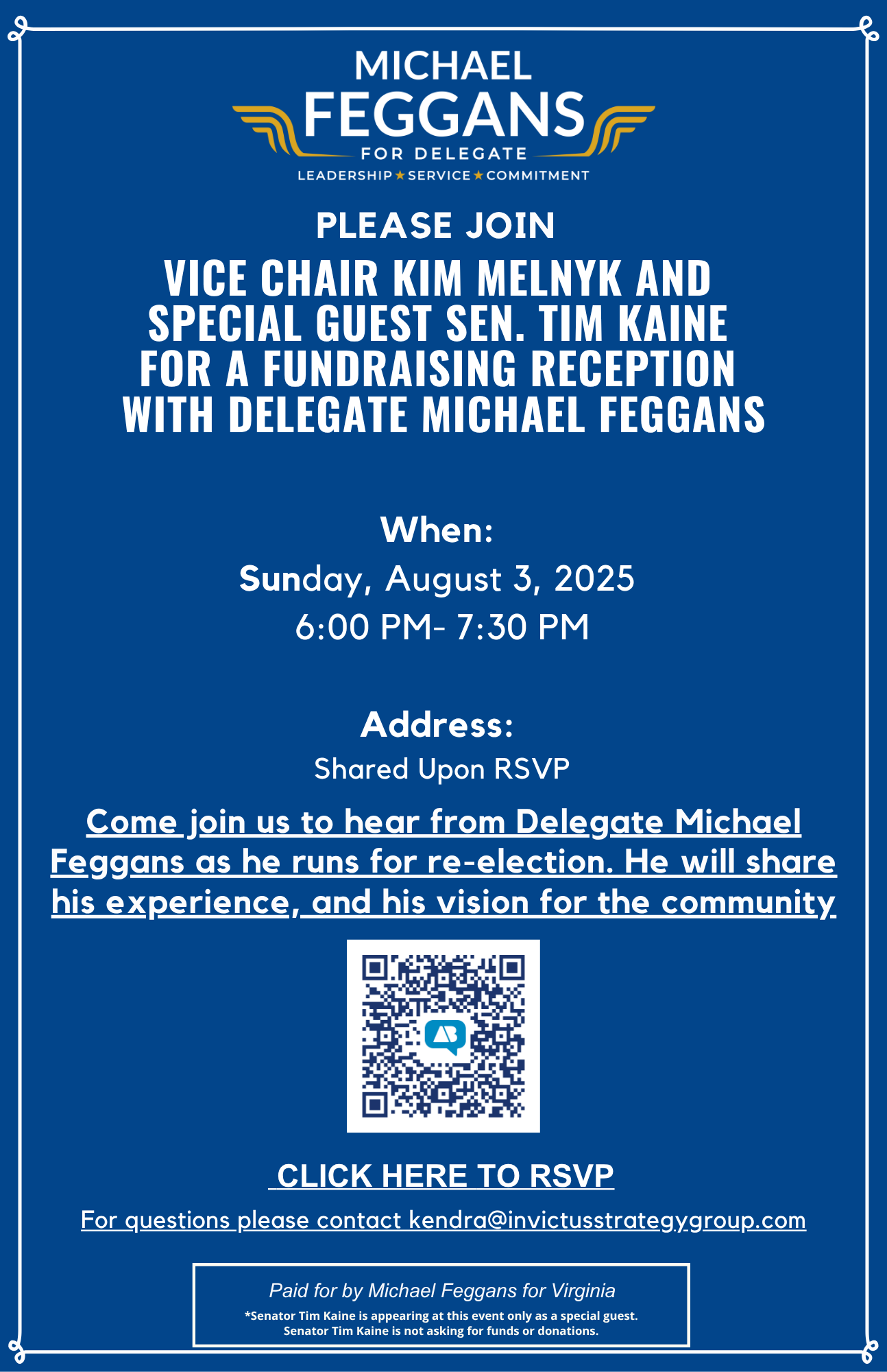 Please Join Vice Chair Kim Melnyk and special Guest Sen. Tim Kaine For A Fundraising Reception with Delegate Michael Feggans!