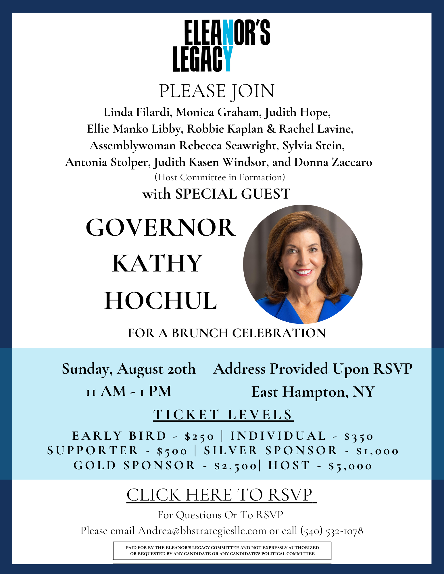 Please join Linda Filardi, Monica Graham, Judith Hope, Ellie Manko Libby, Robbie Kaplan & Rachel Lavine, Assemblywoman Rebecca Seawright, Sylvia Stein, Antonia Stolper, Judith Kasen Windsor and Donna Zaccaro