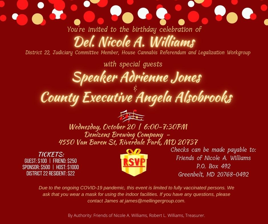 Join Del. Nicole Williams for a birthday celebration on Wednesday, October 20th!