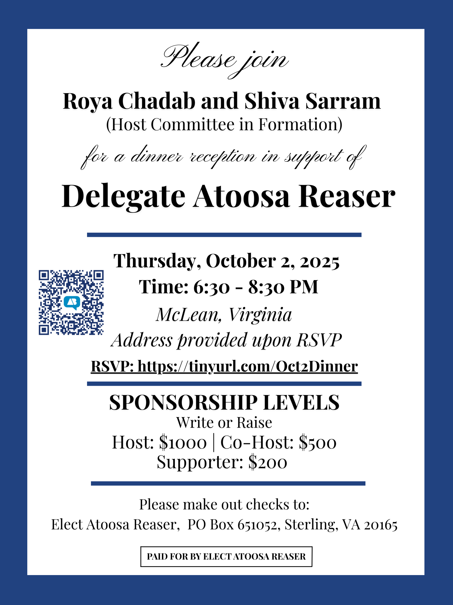 Delegate Atoosa Reaser represents Virginia’s 27th House District, the easternmost part of Loudoun County, including Sterling, Potomac Falls, Dulles, and parts of Chantilly and Ashburn.