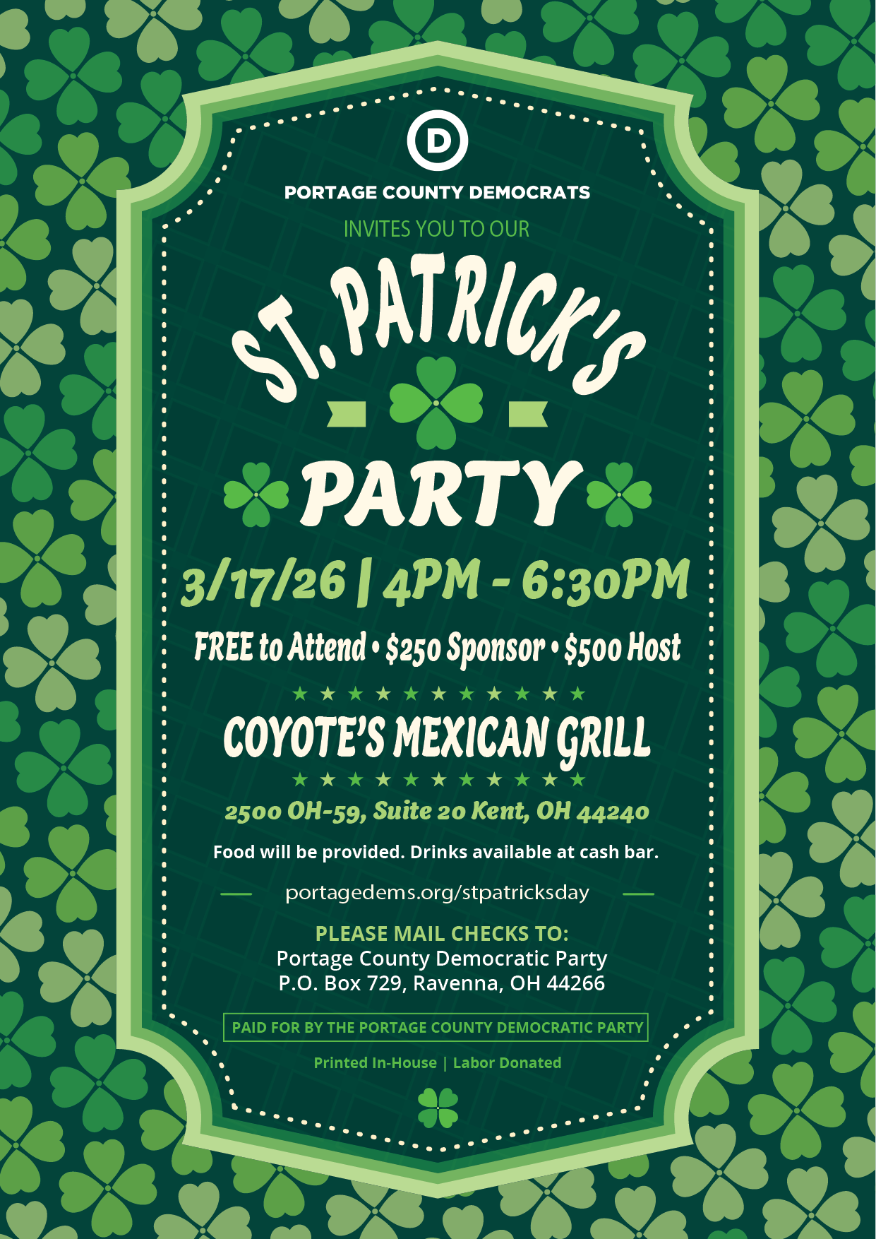 Join the Portage County Democratic Party on Monday, March 17th for our annual St. Patrick's Day Party!