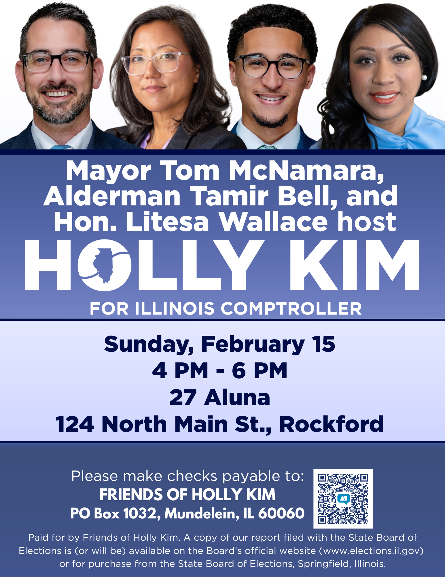 Join the Mayor of Rockford Tom McNamara, Alderman Tamir Bell and Hon. Litesa Wallace for a special event for Lake County Treasurer and Illinois State Comptroller Holly Kim!