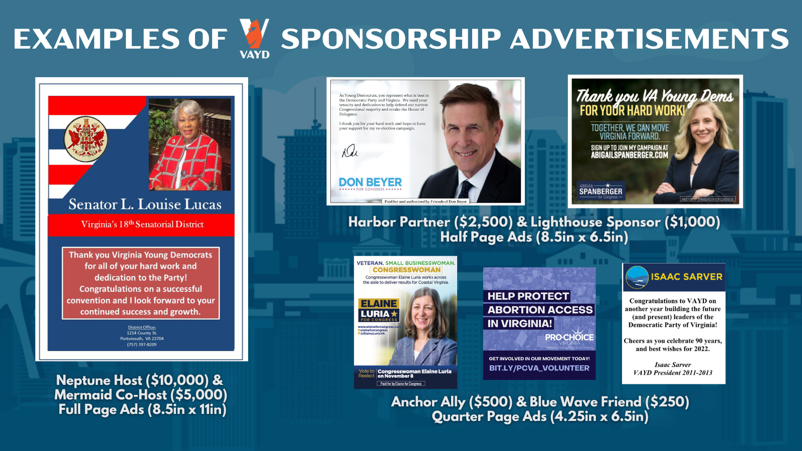 Thank you for considering a sponsorship of the Virginia Young Democrats Annual Convention and Awards Gala. Your financial support is important to our success and will help us ensure that every young person seeking to participate is able.