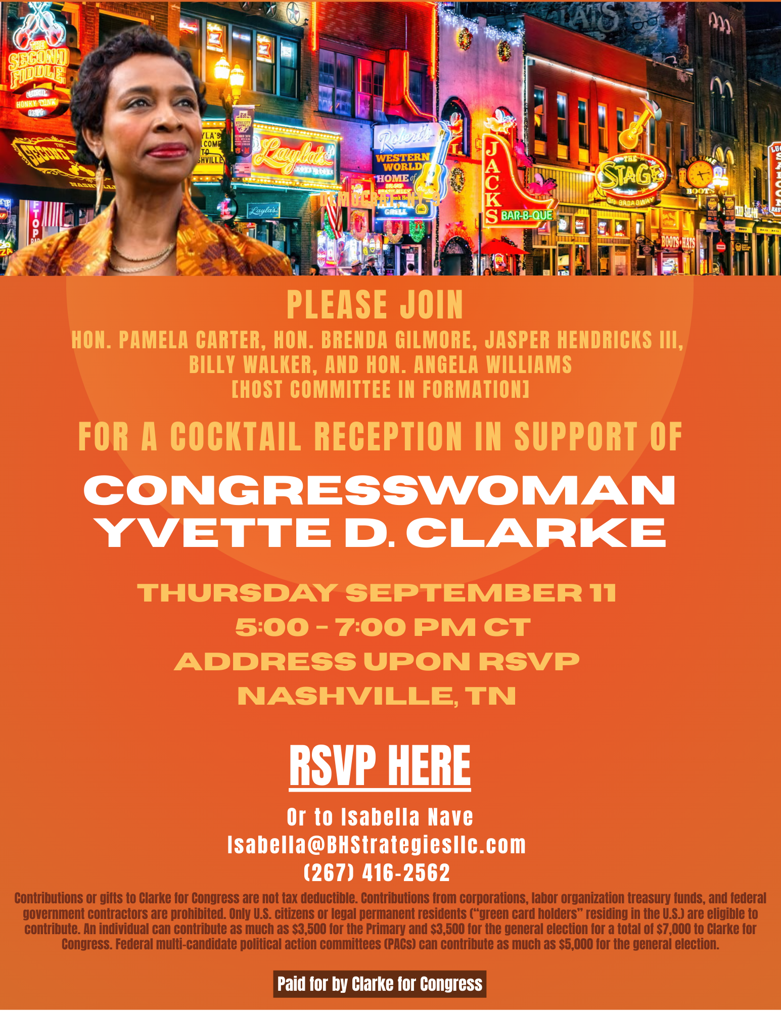 Please Join Congresswoman Yvette D. Clarke for a Cocktail Reception in Nashville!
